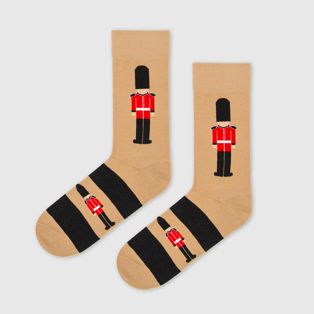Using a minimalist design and a calm camel colour, we have chosen a more classic design, which complements our portfolio of bold and colourfully rich designs. Crafted from luxurious combed cotton, the socks feature the traditional British Queen’s Guard, who without doubt, take care of the most iconic individual in British history, Her Royal Majesty the Queen.