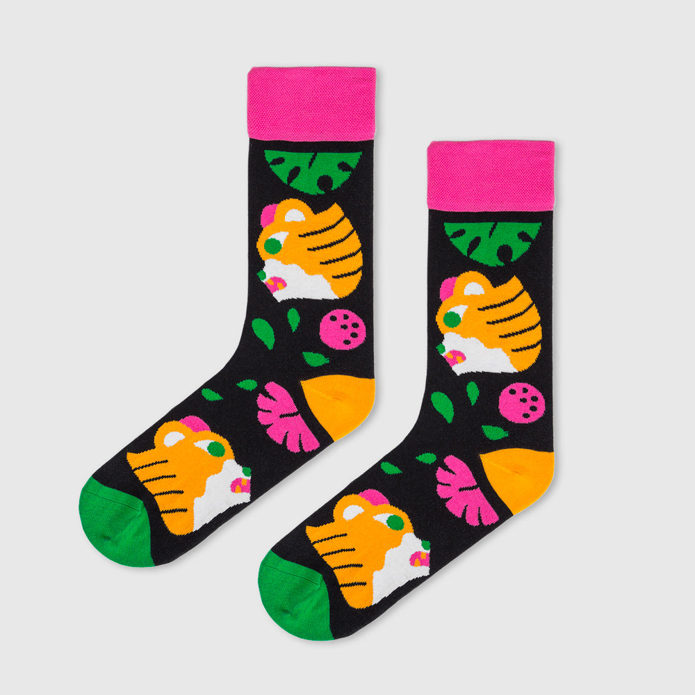 Awesome idea to raise money for WWF, I am very involved in the environment and the future of this planet and all its beautiful nature. So let's do this. For the design, I wanted to portray something "cool" and "fierce" on the socks, a little something that is hidden most of the time but every now and then you see a flash of the tiger that boosts your mood and feeling. I wanted the socks to be black, but I couldn't resist throwing in some awesome bright colors, this just adds so much personality to both the socks and the person wearing it. I wear yellow and pink socks all the time and my friends make fun of me but it is a little detail that shows who I am and I feel confident to rock some cool pink socks.